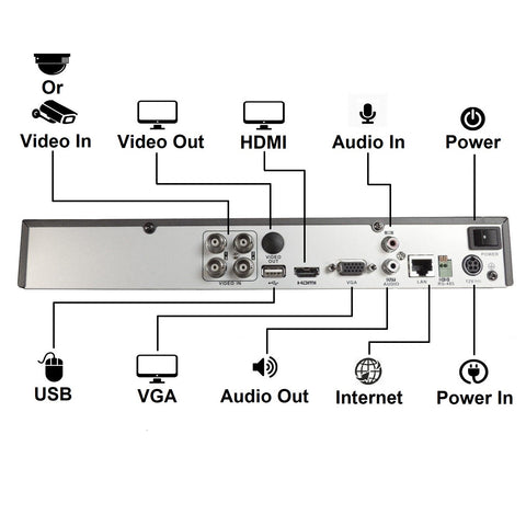 • 4CH 5in1 DVR x 1, Hard Drive Cable x 1, DVR Remote Control, USB Mouse, CMS Software CD for Windows PC and Apple Mac, 12VDC/3A Power Supply, User manual